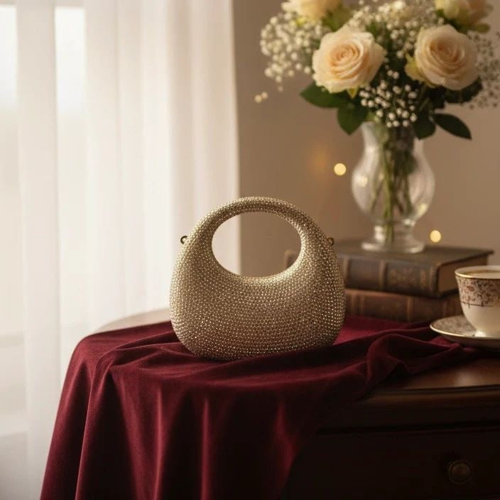 The Shimmer Grace Clutch features a sophisticated design adorned with diamonds, elevating its aesthetic appeal. This clutch is currently trending, reflecting contemporary fashion demands. Its compact size is ideal for essential items, making it a practical accessory for formal occasions.